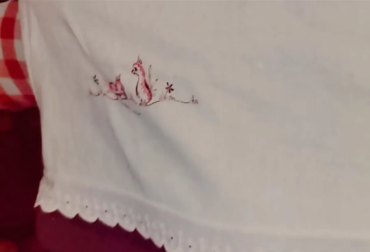 Mijn oude witte lakentje met geborduurd vogeltje is per ongeluk bij de Kringloopwinkel van Sherpa Baarn terecht gekomen.