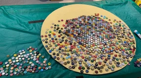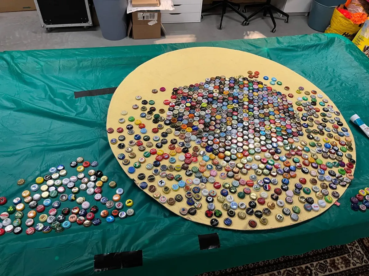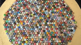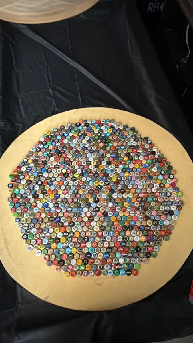 Wij hebben jarenlang allemaal verschillende kroonkurken gespaard. Mijn vrouw plakte dit op een grote plaat en had bijna 900 unieke dopjes. Tot de plaat 2 maanden geleden kwijtraakte. Wij hadden deze op onze (dichte) aanhanger gelegd en zijn deze vergeten eraf te halen. De plaat is er onderweg afgewaaid en kapot gereden.